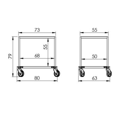 Transportný vozík z nehrdzavejúcej ocele AISI304. Úložné plochy stolíka sú vo vyhotovení s 12 mm prelisom, nosnosťou 50 kg a antirezonančnou výstuhou. Celková nosnosť vozíka je 100 kg. Kolesá sú plastové, s mäkčeným behúňom, ktorý nezanecháva stopy a sú vybavené nárazníkmi. Priemer kolies je 125 mm, z toho 2 sú brzdené.