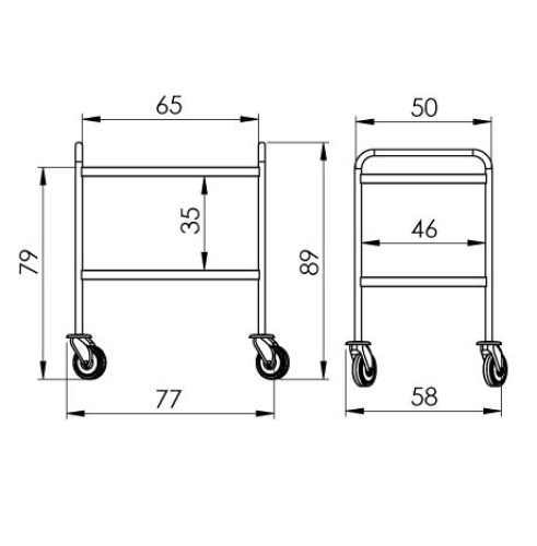 Transportný vozík z nehrdzavejúcej ocele AISI304. Úložné plochy stolíka sú vo vyhotovení s 12 mm prelisom, nosnosťou 50 kg a antirezonančnou výstuhou. Celková nosnosť vozíka je 100 kg. Kolesá sú plastové, s mäkčeným behúňom, ktorý nezanecháva stopy a sú vybavené nárazníkmi. Priemer kolies je 125 mm, z toho 2 sú brzdené.
