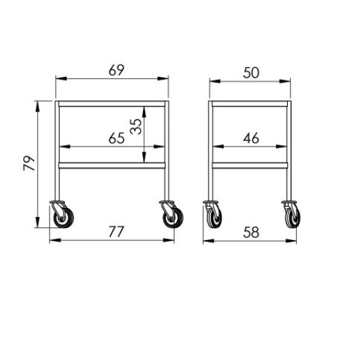 Transportný vozík z nehrdzavejúcej ocele AISI304. Úložné plochy stolíka sú vo vyhotovení s 12 mm prelisom, nosnosťou 50 kg a antirezonančnou výstuhou. Celková nosnosť vozíka je 100 kg. Kolesá sú plastové, s mäkčeným behúňom, ktorý nezanecháva stopy a sú vybavené nárazníkmi. Priemer kolies je 125 mm, z toho 2 sú brzdené.
