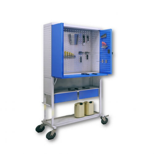Kovová dielenská skriňa na kolesách. Skriňa má perforovanú zadnú stenu a boky, ktoré umožňujú montáž doplnkového vybavenia (háky, konzoly, atď.) na uchytenie náradia. Vozík má dve zásuvky a jedno uzamykateľné oddelenie.