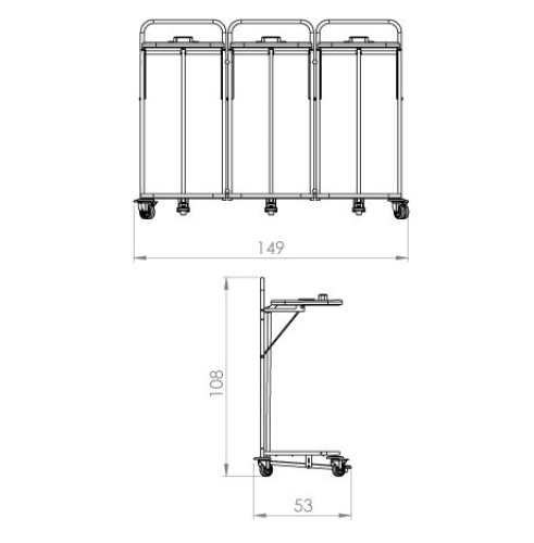 Vozík s kovovou konštrukciou ošetrenou šedou antimikrobiálnou farbou. Veká sú plastové a majú nohou ovládané otváranie. Dostupné farby plastov: červená, modrá, zelená, žltá. Držiak vaku je sklopný: 3 x 120 l, nosnosť je 15 kg. Kolesá sú otočné s plastovými nárazníkmi, priemer 75 mm, 2 brzdené. Celková nosnosť výrobku je 45 kg.