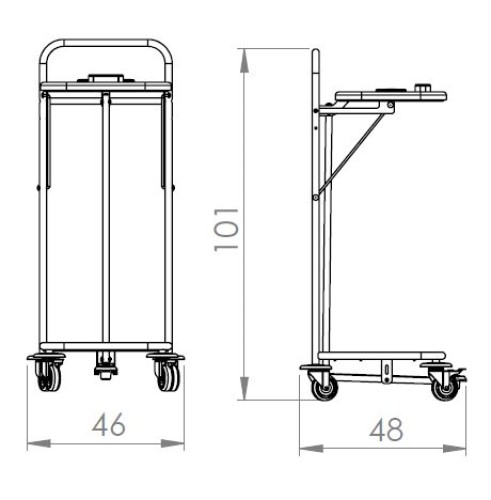 Vozík s kovovou konštrukciou ošetrenou šedou antimikrobiálnou farbou. Veká sú plastové a majú nohou ovládané otváranie. Dostupné farby plastov: červená, modrá, zelená, žltá. Držiak vaku je sklopný: 1 x 80 l, nosnosť je 15 kg. Kolesá sú otočné s plastovými nárazníkmi, priemer 75 mm, 2 brzdené. Celková nosnosť výrobku je 45 kg.