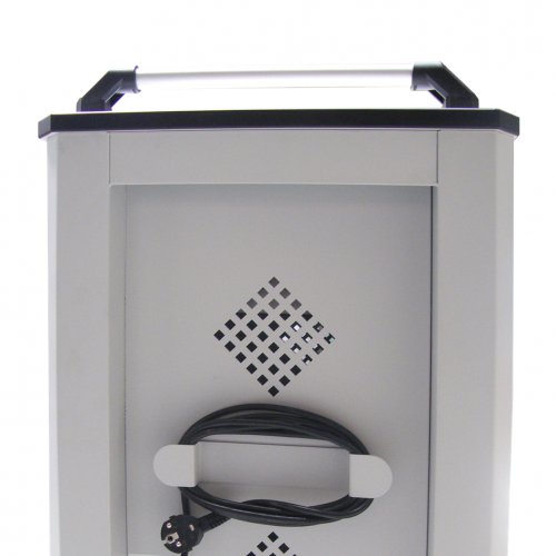 Napájanie je z elektrickej siete. Dodávame varianty s elektroinštaláciou alebo bez elektroinštalácie. Pre menšie zaťaženie siete sú dodávané so zabudovaným sekvencerom, ktorý prepína nabíjanie medzi jednotlivými zariadeniami. Ako ochrana pred poškodením je vozík ošetrený poistkou proti prepätiu a tiež hlavným vypínačom. Pre pohodlné pripojenie do siete je dodávaný s 3 metrovým káblom. Manipulácia s vozíkmi je jednoduchá vďaka pohyblivým - pogumovaným kolieskam, 2 kolieska brzdené a madlu. Dvere sú otočné, vybavené cylindrickou zámkou s dvojbodovým uzamykaním. Dômyselne umiestnené otvory na stenách boxu zabezpečujú cirkuláciu vzduchu a chránia pred prehriatím zariadení.