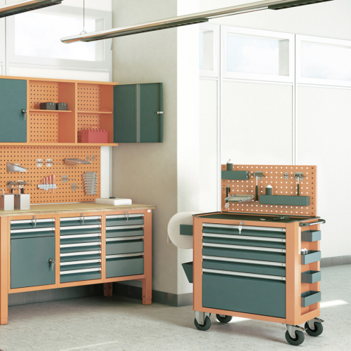 Kovový dielenský vozík na kolieskach, 2 brzdené. Je možné objednať široký sortiment doplnkov k vozíku.