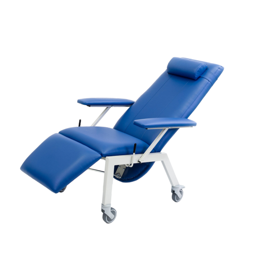 Kreslo s bielou kovovou konštrukciou a koženkovým čalúnením. Je vybavené trojdielnym polohovaním pomocou plynového piestu a sklopnými opierkami rúk. Kreslo je mobilné, vybavené kolieskami priemeru 100 mm, dve s brzdou. Pohyb operadla a opierky nôh je synchronizovaný. Súčasťou kresla je aj podhlavník. Výška sedacej plochy je 510 mm, šírka 520 mm a hĺbka 440 mm. Nosnosť kresla je 150 kg. Farba koženkového poťahu je voliteľná bez príplatku, viď. obrázky produktu.