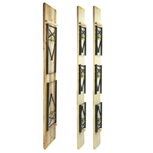Skladací záhradný set, ktorý sa skladá z jedného stola a dvoch lavíc. Konštrukcia je kovová v tmavozelenej farbe. Doska na stole a laviciach je masívne drevo. Mechanizmus stola aj lavíc je sklápací. Tovar je zvyčajne k rýchlemu dodaniu.