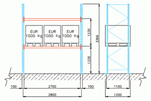 Základný regál s max. nosnosťou jednej palety 1000 kg. Dodáva sa vrátane kotviaceho materiálu, pätiek, a podložiek pod stojky. Konštrukcia je z pozinkovanej ocele. Stĺpy sú modrej farby, RAL 5010. Nosníky sú oranžovej farby, RAL 2004. Počet úrovní: zem + 2 úrovne. Police sú nastaviteľné po 70 mm.