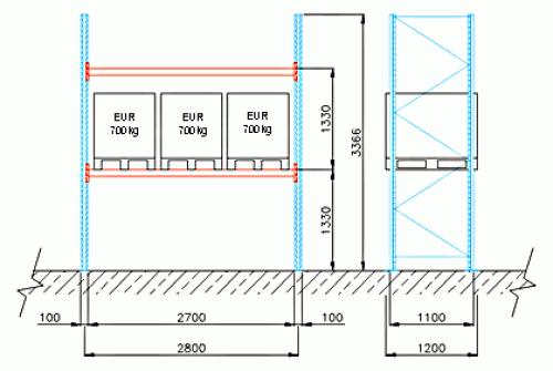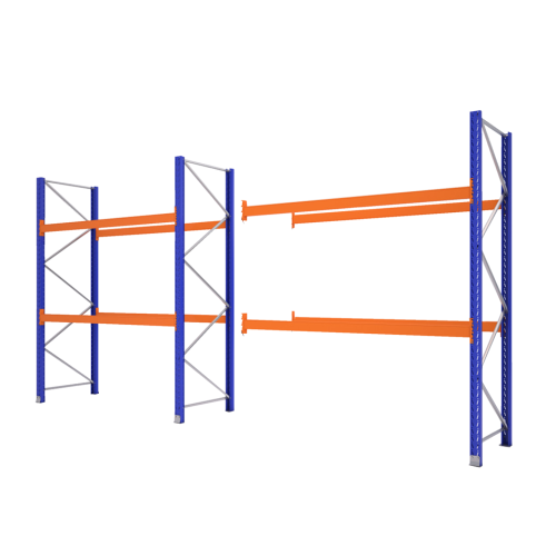 Základný regál s max. nosnosťou jednej palety 700 kg. Dodáva sa vrátane kotviaceho materiálu, pätiek, a podložiek pod stojky. Konštrukcia je z pozinkovanej ocele. Stĺpy sú modrej farby, RAL 5010. Nosníky sú oranžovej farby, RAL 2004. Počet úrovní: zem + 2 úrovne. Police sú nastaviteľné po 70 mm.