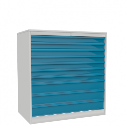 Kovová dielenská skriňa so zásuvkami. Vybavená zásuvkami na guličkových výsuvoch pre zabezpečenie plynulého chodu. Stabilná konštrukcia a systém zabezpečenia proti vysunutiu viacerých zásuviek súčasne. Možnosť rozdelenia zásuviek deliacimi priečkami. Výška zásuviek: 7 x 75 mm, 3 x 125 mm.
