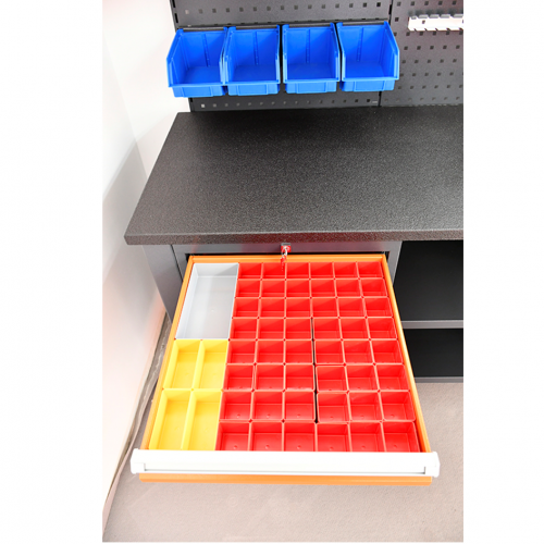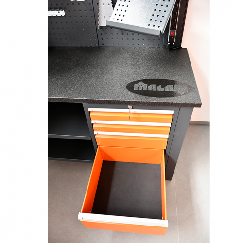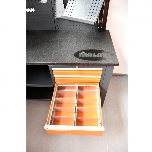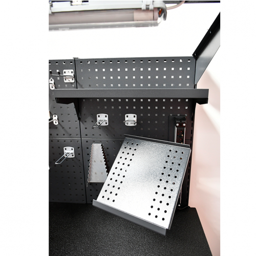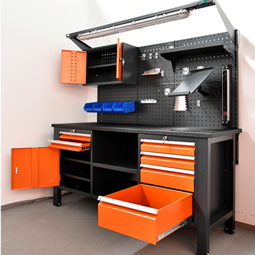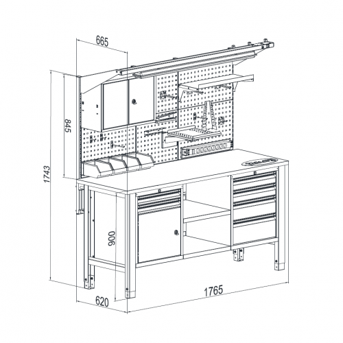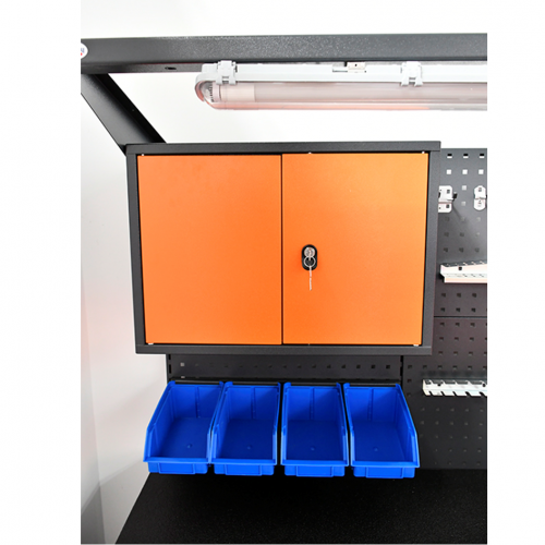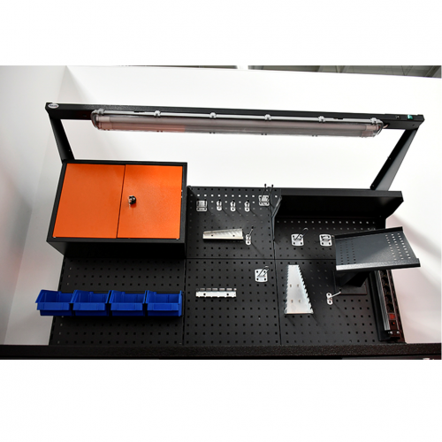 Dielenský stôl s nadstavbou. Nadstavba obsahuje perforovaný panel so skriňou na náradie, svetlo (LED 2 x 18 W, 6500 K, IP 20), konzoly a držiaky na náradie, elektrické zásuvky (8 x 230 V, uzemnené), policu, nádoby a držiak na monitor. Dodávané v demontovanom stave.